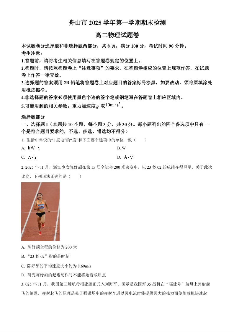 高二物理--浙江省舟山市2025-2026学年高二上学期期末考试
