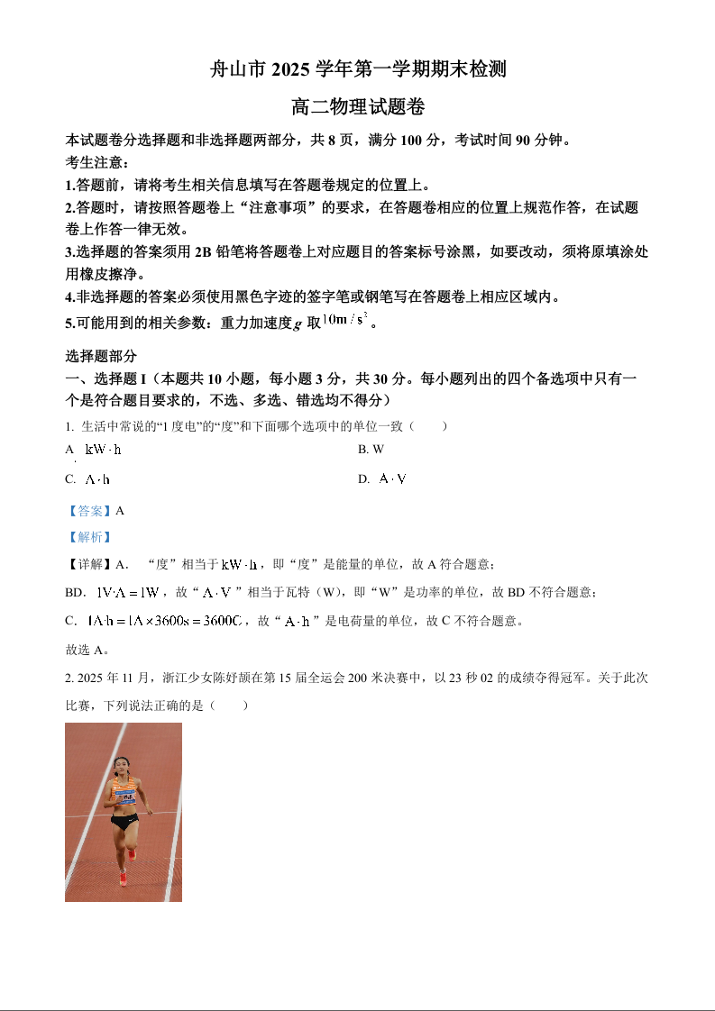 高二物理答案--浙江省舟山市2025-2026学年高二上学期期末考试