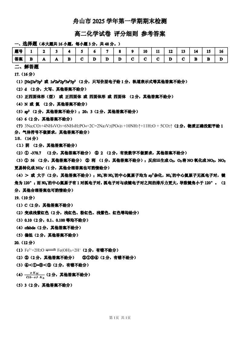 高二化学答案--浙江省舟山市2025-2026学年高二上学期期末考试
