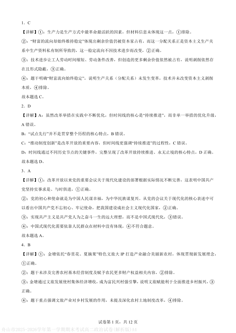高二政治(解析版)--浙江省舟山市2025-2026学年高二上学期期末考试