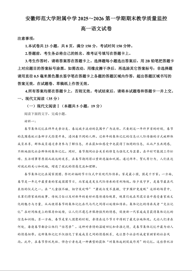 高一语文(原卷版)--安徽省芜湖市师大附中2025-2026学年高一上学期期末