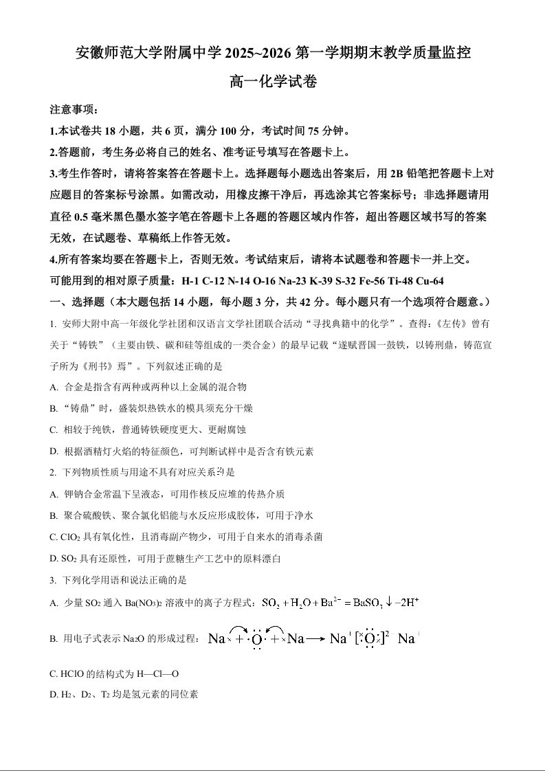 高一化学(原卷版)--安徽省芜湖市师大附中2025-2026学年高一上学期期末
