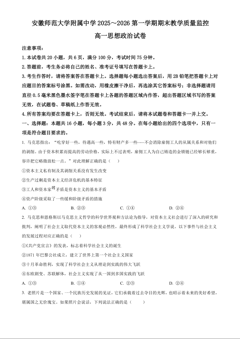 高一政治(原卷版)--安徽省芜湖市师大附中2025-2026学年高一上学期期末