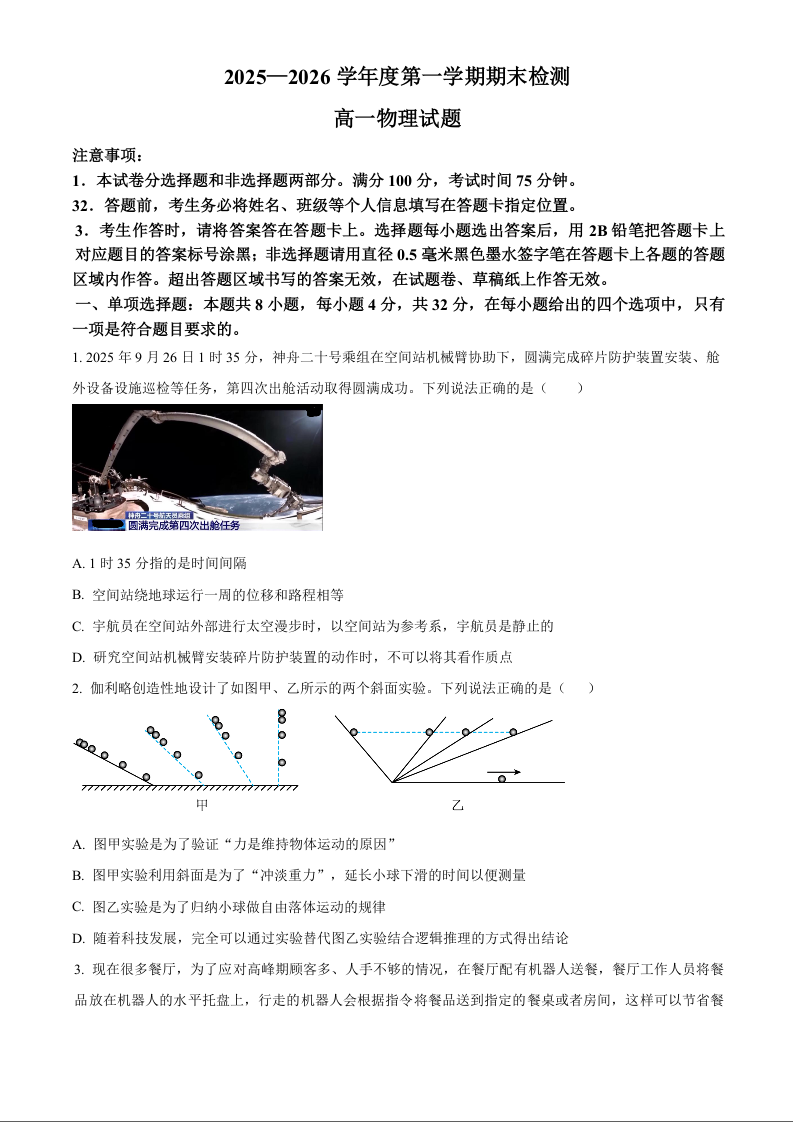 高一物理(原卷版)--安徽省宣城市2025-2026学年高一上学期期末检测
