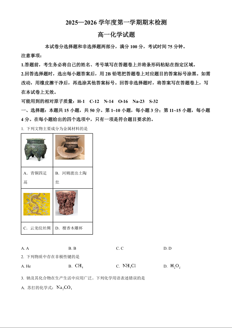 高一化学(原卷版)--安徽省宣城市2025-2026学年高一上学期期末检测