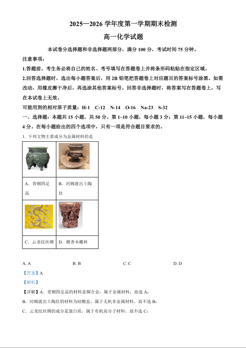 高一化学(解析版)--安徽省宣城市2025-2026学年高一上学期期末检测