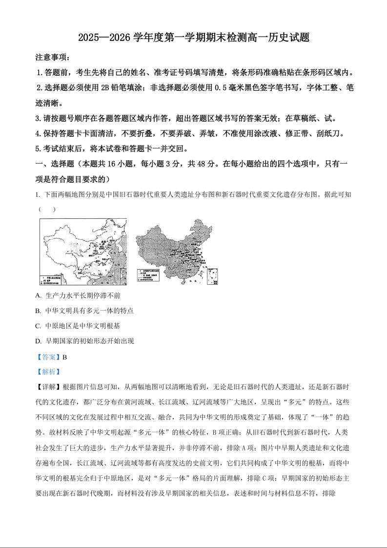 高一历史(解析版)--安徽省宣城市2025-2026学年高一上学期期末检测