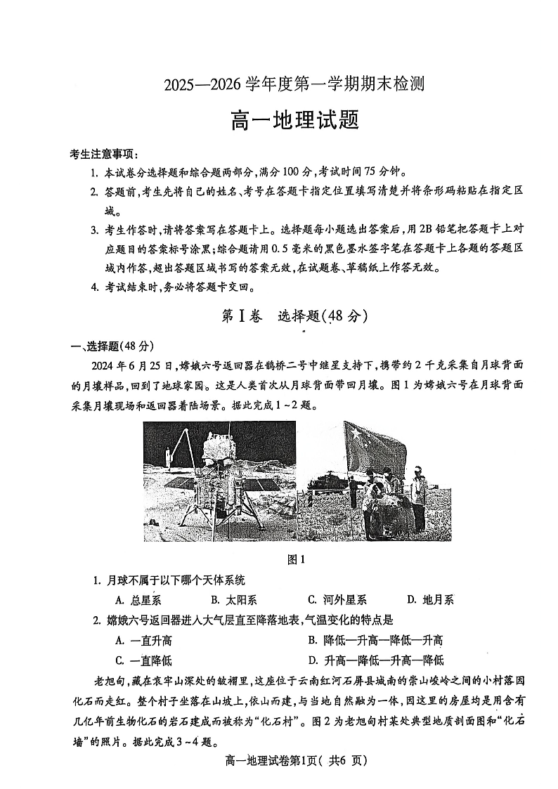 高一地理--安徽省宣城市2025-2026学年高一上学期期末检测