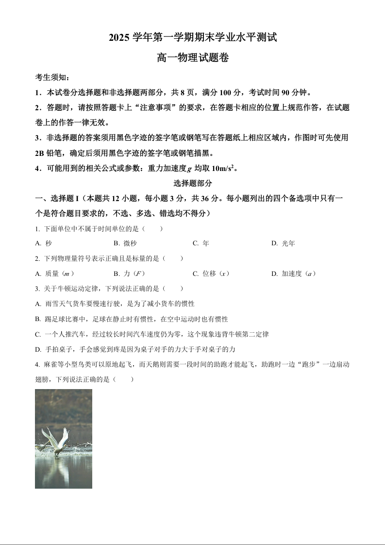 高一物理--浙江省杭州市2025-2026学年高一上学期期末学业水平测试