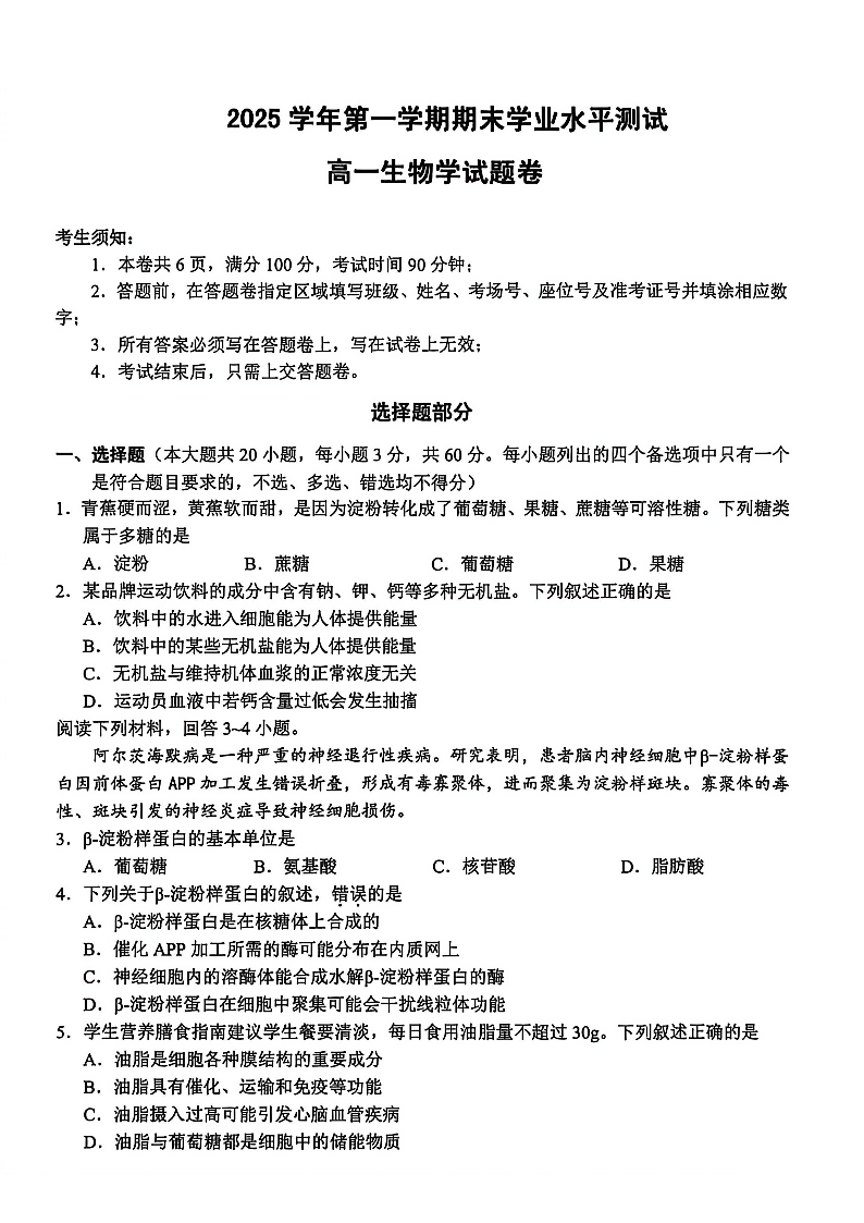 高一生物--浙江省杭州市2025-2026学年高一上学期期末学业水平测试