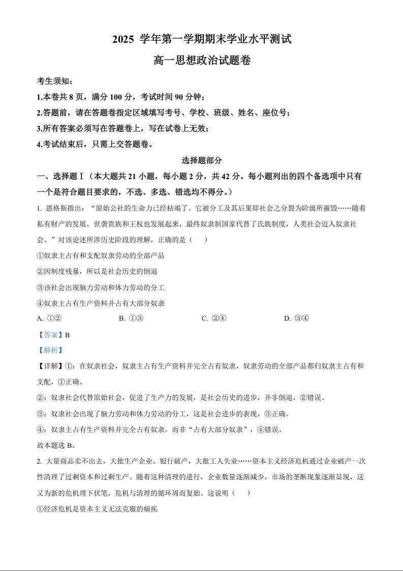 高一政治答案--浙江省杭州市2025-2026学年高一上学期期末学业水平测试