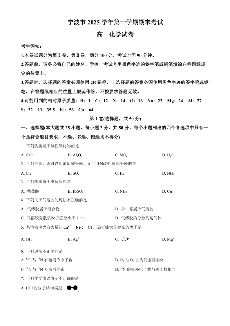 高一化学--浙江省宁波市2025-2026学年高一上学期期末考试