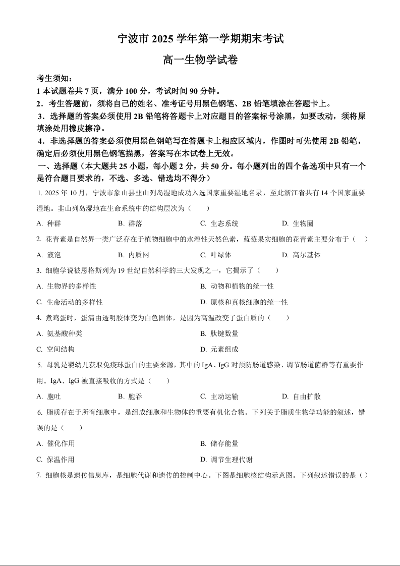 高一生物--浙江省宁波市2025-2026学年高一上学期期末考试