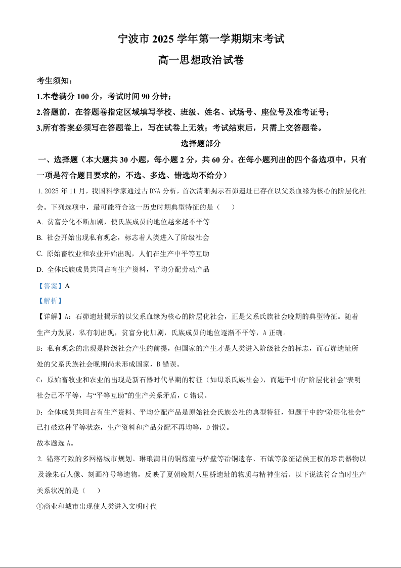 高一政治答案--浙江省宁波市2025-2026学年高一上学期期末考试