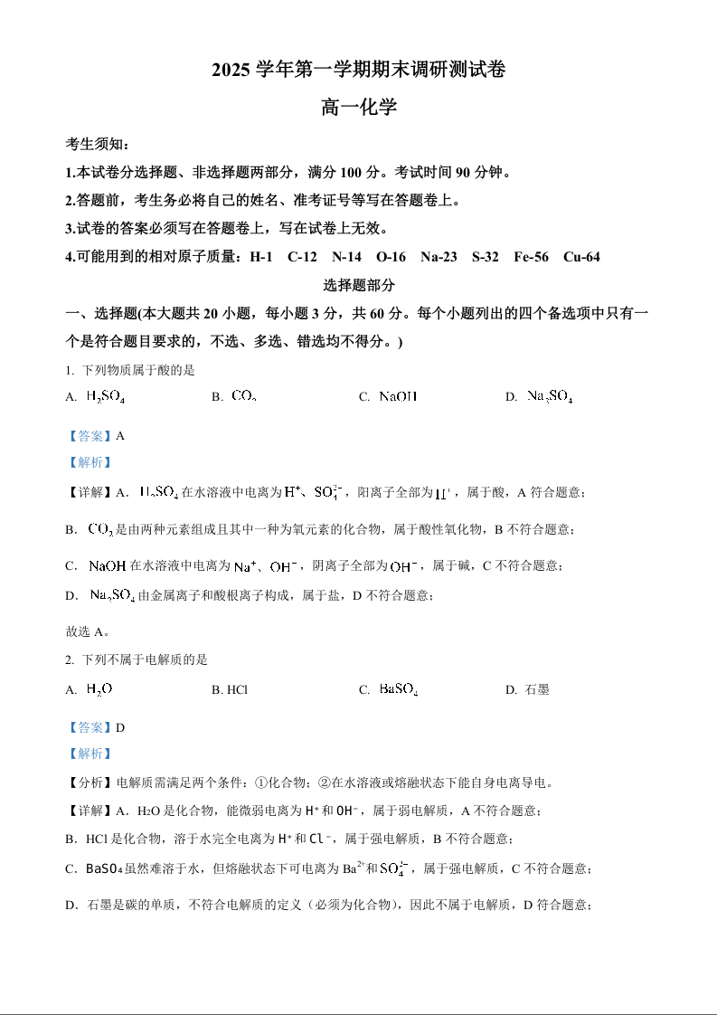 高一化学答案--浙江省湖州市2025-2026学年高一上学期2月期末考试