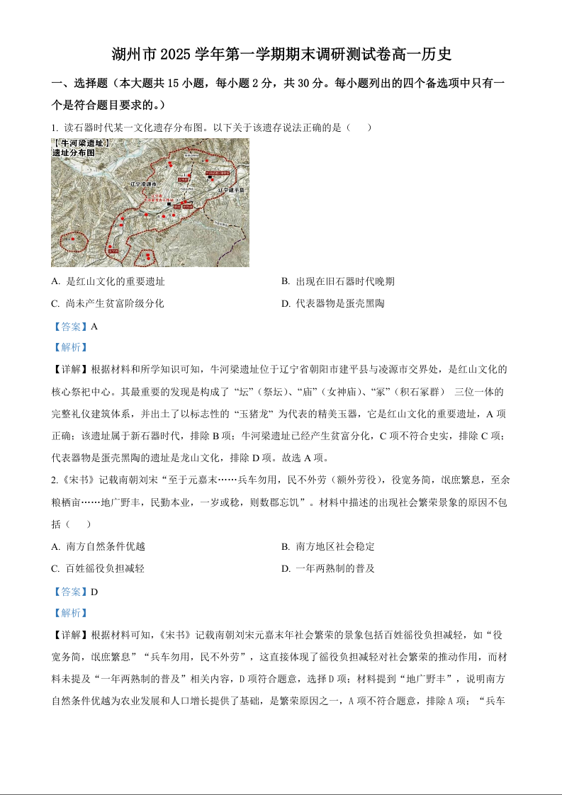 高一历史答案--浙江省湖州市2025-2026学年高一上学期2月期末考试
