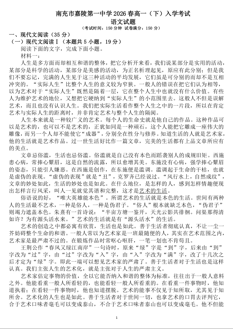 高一语文--四川省南充市嘉陵一中2025-2026学年高一下学期入学考试
