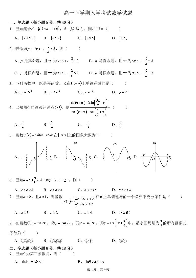 高一数学+答案--四川省南充市嘉陵一中2025-2026学年高一下学期入学考试