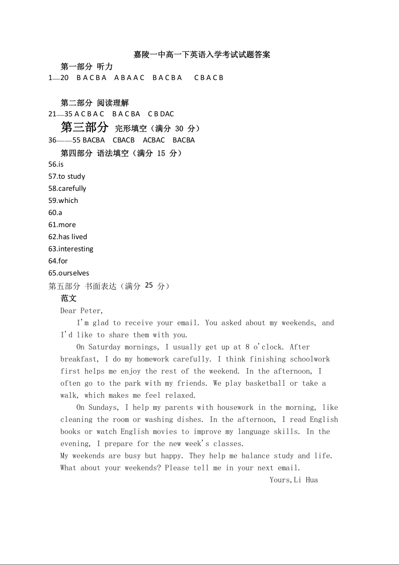 高一英语答案--四川省南充市嘉陵一中2025-2026学年高一下学期入学考试