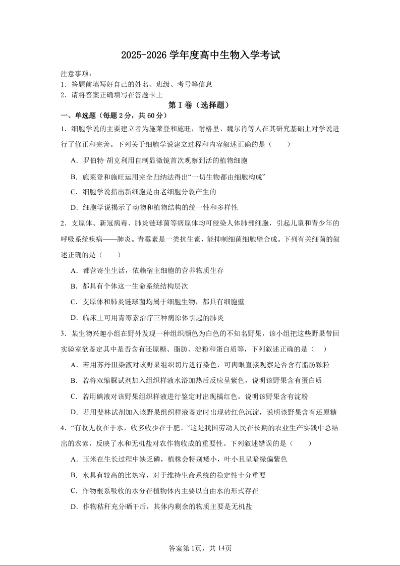 高一生物--四川省南充市嘉陵一中2025-2026学年高一下学期入学考试
