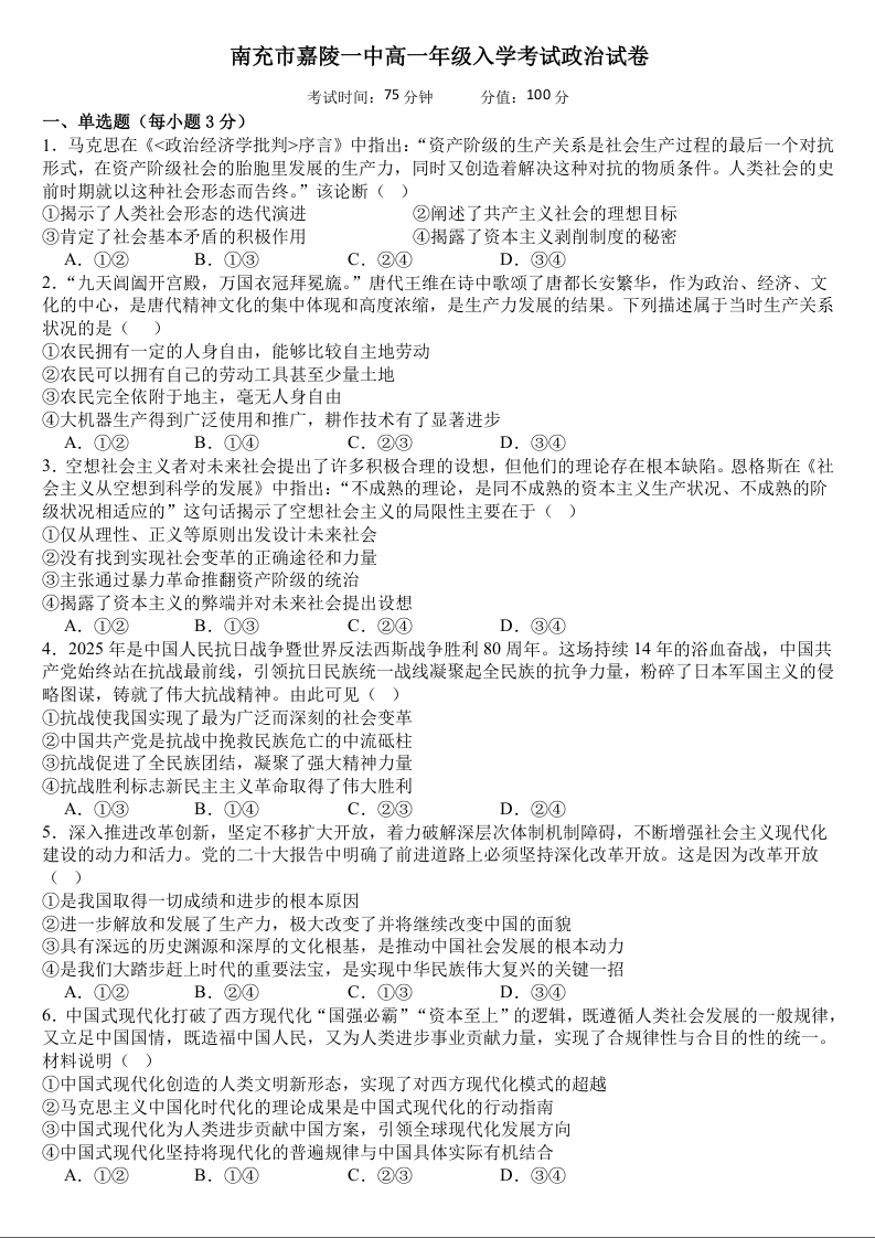 高一政治--四川省南充市嘉陵一中2025-2026学年高一下学期入学考试