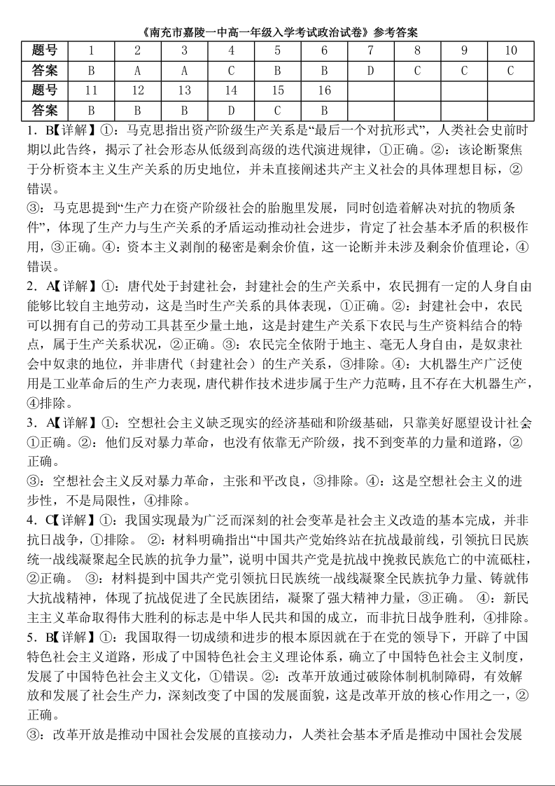 高一政治答案--四川省南充市嘉陵一中2025-2026学年高一下学期入学考试
