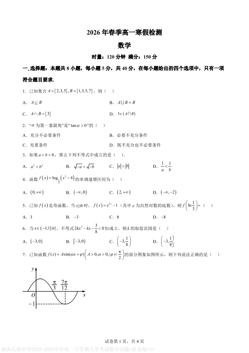 高一数学(原卷版)--湖南省长沙市长郡中学2025-2026学年高一下学期入学考试