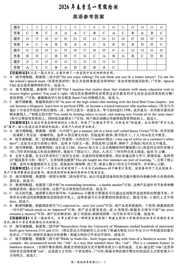 高一英语答案--湖南省长沙市长郡中学2025-2026学年高一下学期入学考试