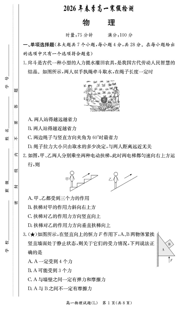 高一物理--湖南省长沙市长郡中学2025-2026学年高一下学期入学考试