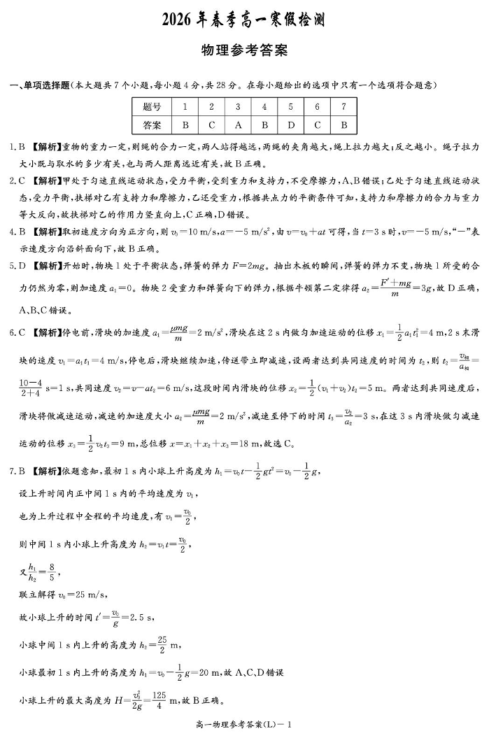 高一物理答案--湖南省长沙市长郡中学2025-2026学年高一下学期入学考试