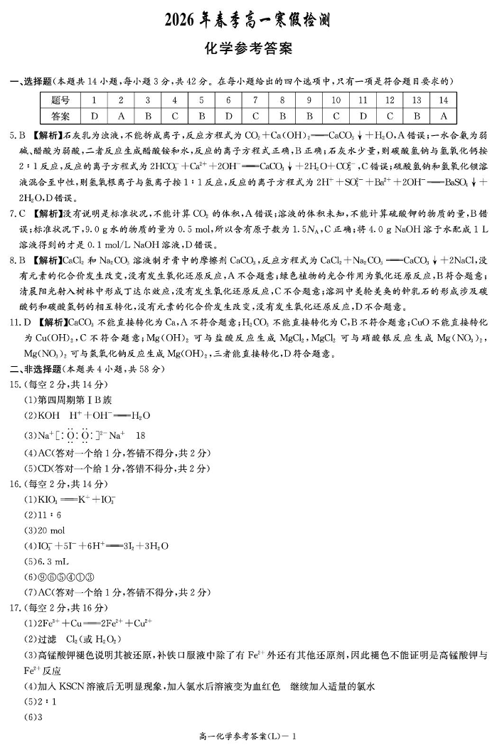 高一化学答案--湖南省长沙市长郡中学2025-2026学年高一下学期入学考试