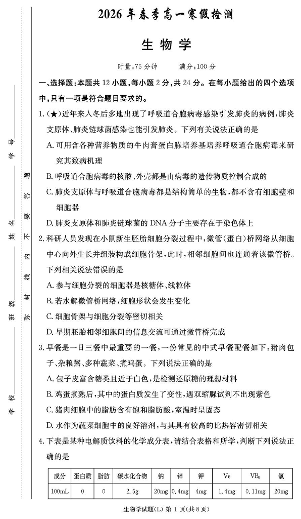 高一生物--湖南省长沙市长郡中学2025-2026学年高一下学期入学考试