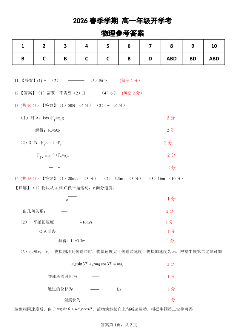 高一物理答案--湖北省恩施高中教学联盟2025-2026学年高一下学期开学考试