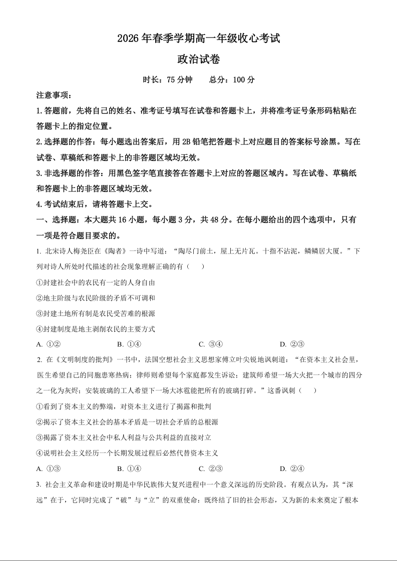 高一政治--湖北省恩施高中教学联盟2025-2026学年高一下学期开学考试