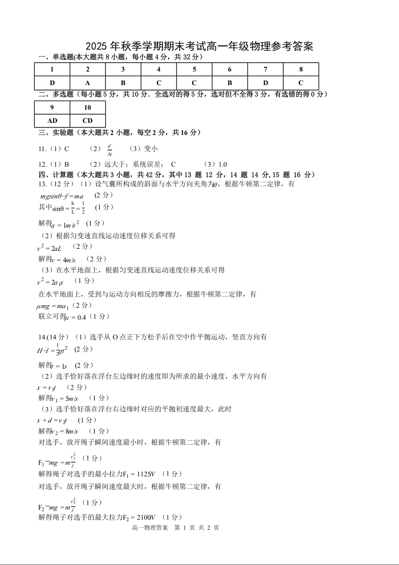 高一物理答案--安徽省合肥市第五中学等六校2025-2026学年高一上学期期末联考