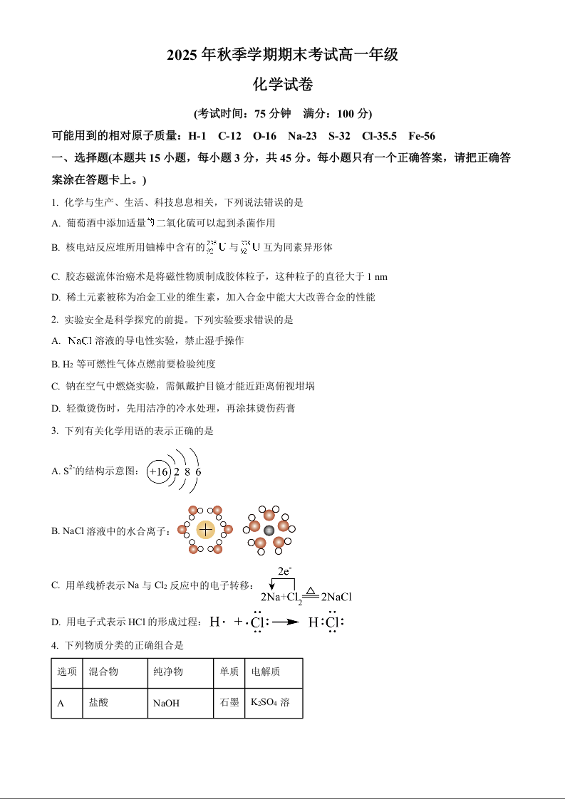 高一化学(原卷版)--安徽省合肥市第五中学等六校2025-2026学年高一上学期期末联考