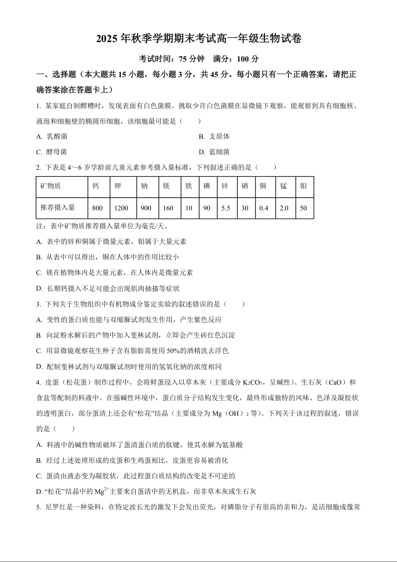 高一生物(原卷版)--安徽省合肥市第五中学等六校2025-2026学年高一上学期期末联考