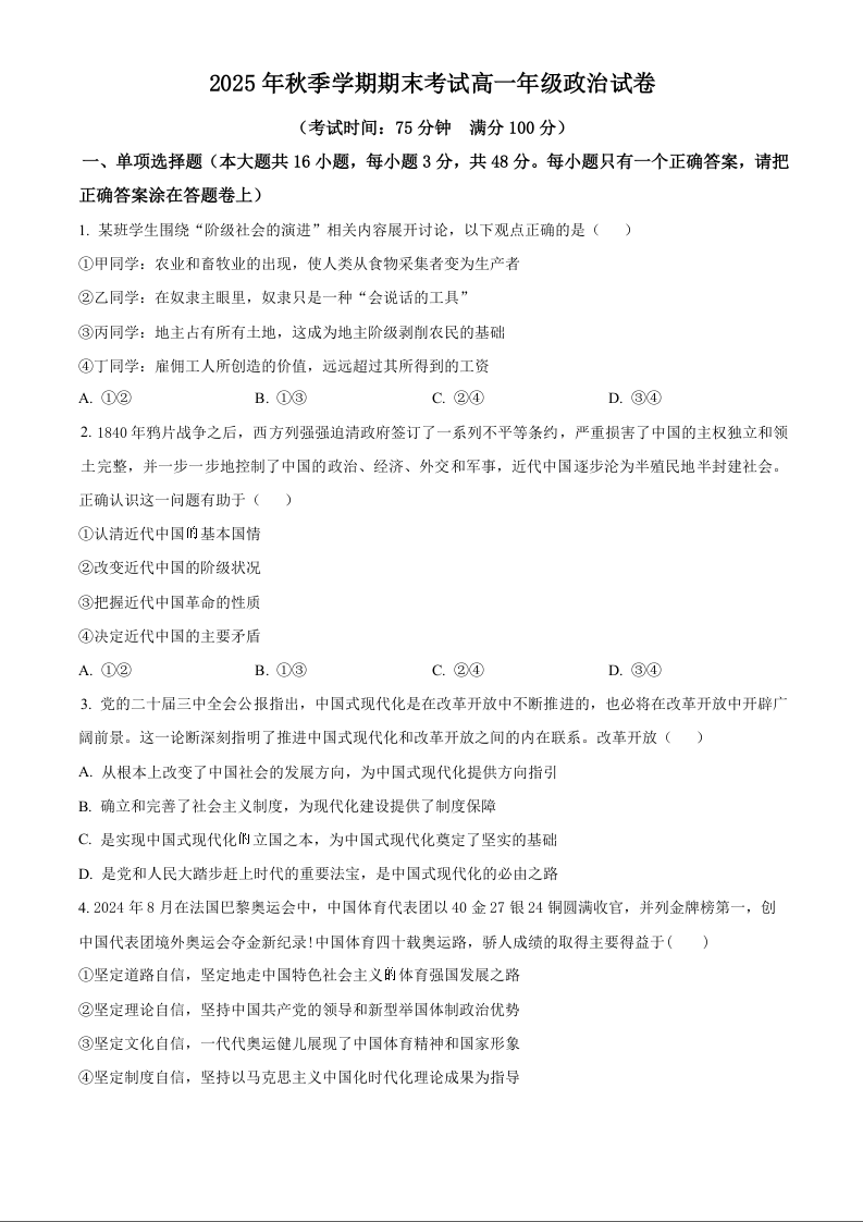 高一政治(原卷版)--安徽省合肥市第五中学等六校2025-2026学年高一上学期期末联考