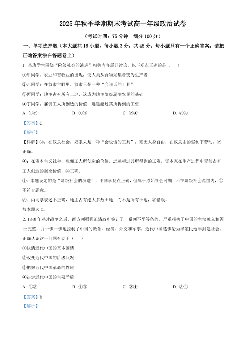 高一政治(解析版)--安徽省合肥市第五中学等六校2025-2026学年高一上学期期末联考