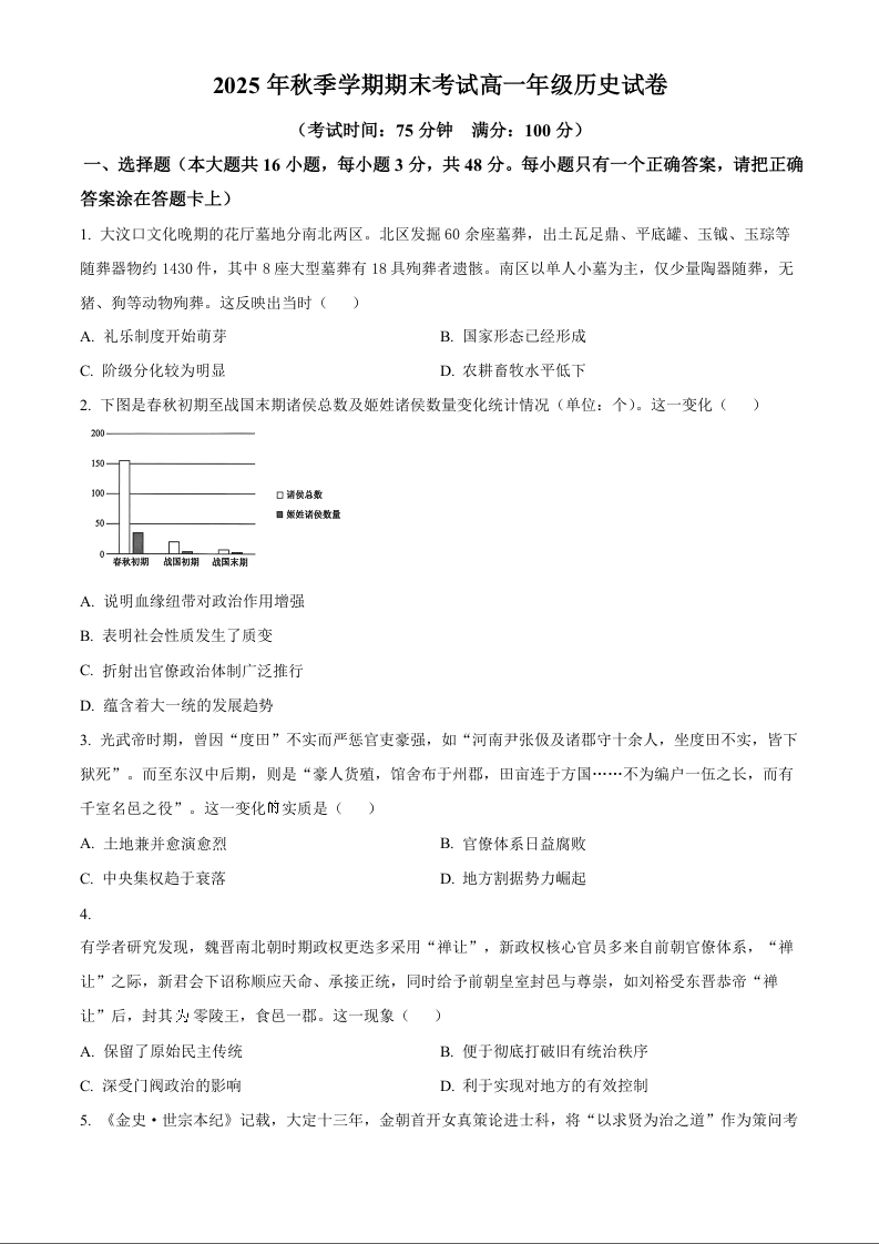 高一历史(原卷版)--安徽省合肥市第五中学等六校2025-2026学年高一上学期期末联考