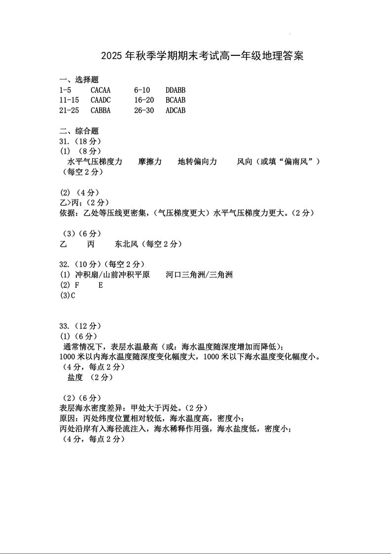 高一地理答案--安徽省合肥市第五中学等六校2025-2026学年高一上学期期末联考