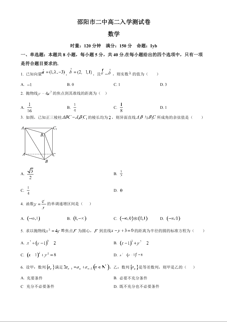 高二数学(原卷版)--湖南省邵阳市第二中学2025-2026学年高二下学期入学考试