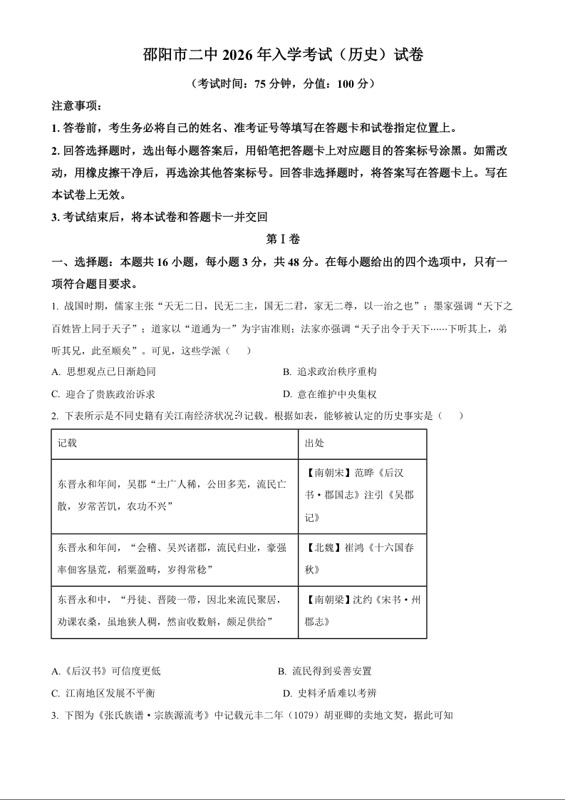 高二历史(原卷版)--湖南省邵阳市第二中学2025-2026学年高二下学期入学考试