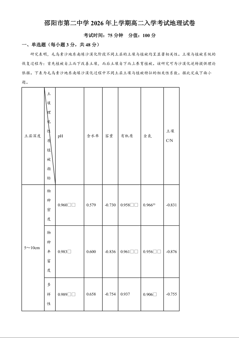 高二地理(解析版)--湖南省邵阳市第二中学2025-2026学年高二下学期入学考试