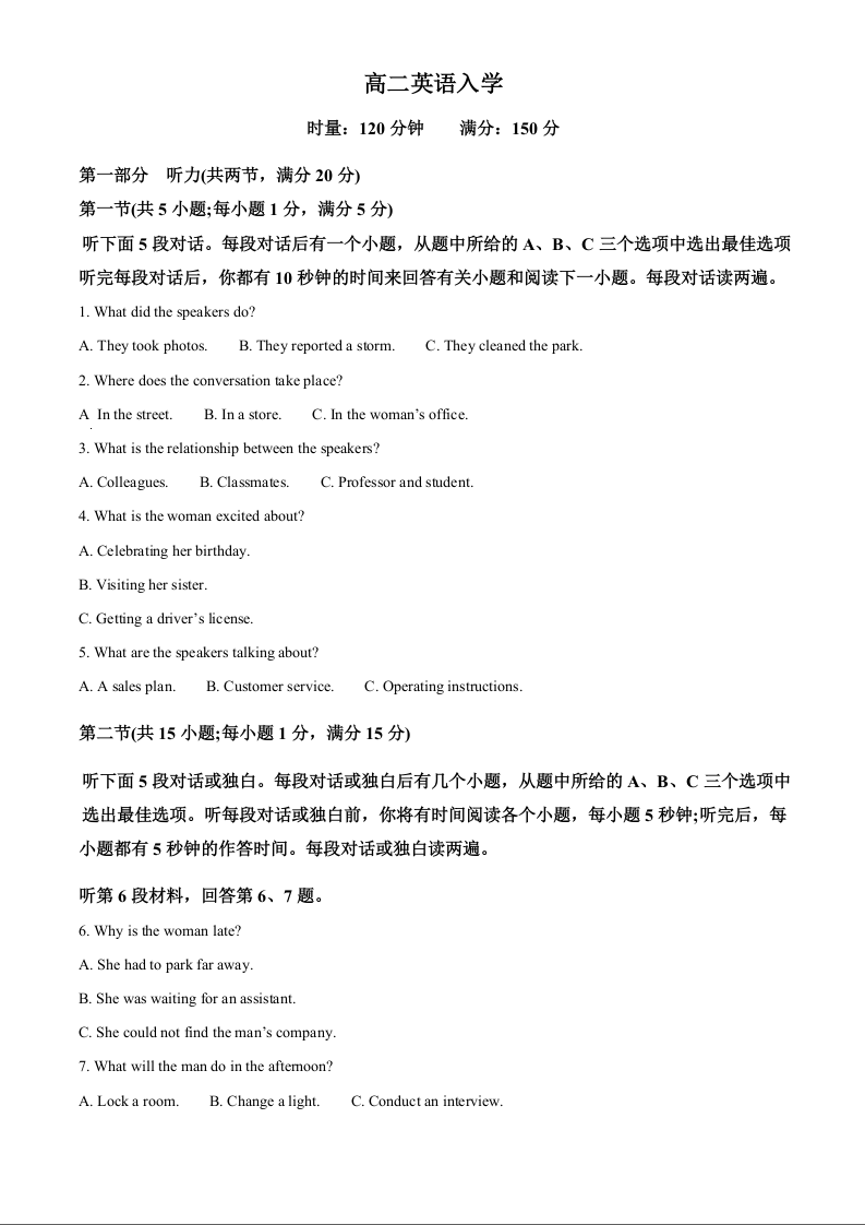 高二英语(原卷版)--湖南省长沙市第一中学2025-2026学年高二下学期入学考试