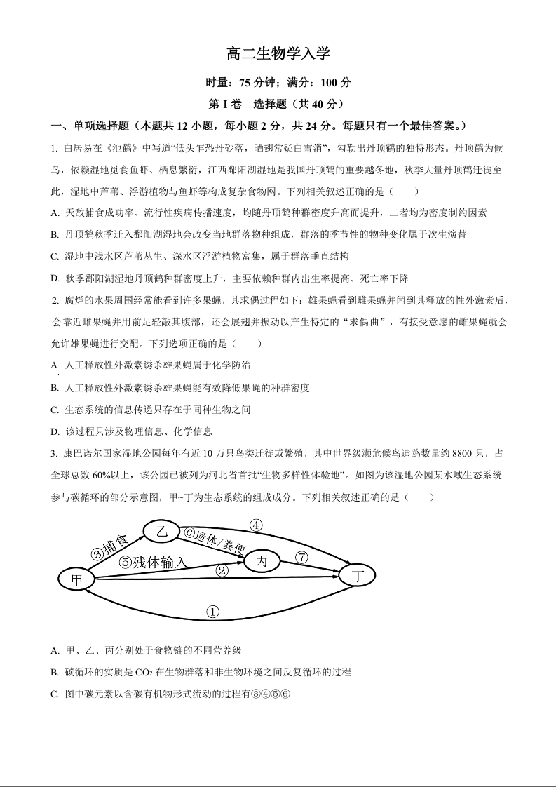 高二生物(原卷版)--湖南省长沙市第一中学2025-2026学年高二下学期入学考试