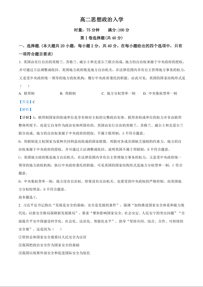 高二政治(解析版)--湖南省长沙市第一中学2025-2026学年高二下学期入学考试