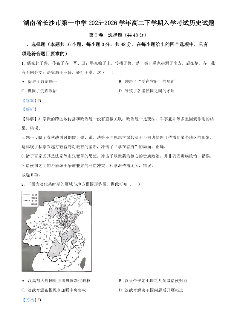 高二历史(解析版)--湖南省长沙市第一中学2025-2026学年高二下学期入学考试
