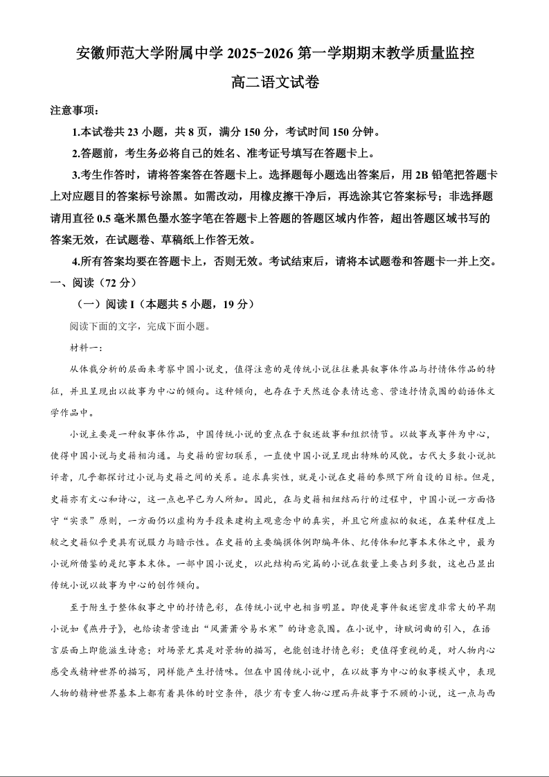高二语文(原卷版)--安徽省芜湖市师大附中2025-2026学年高二上学期期末考试
