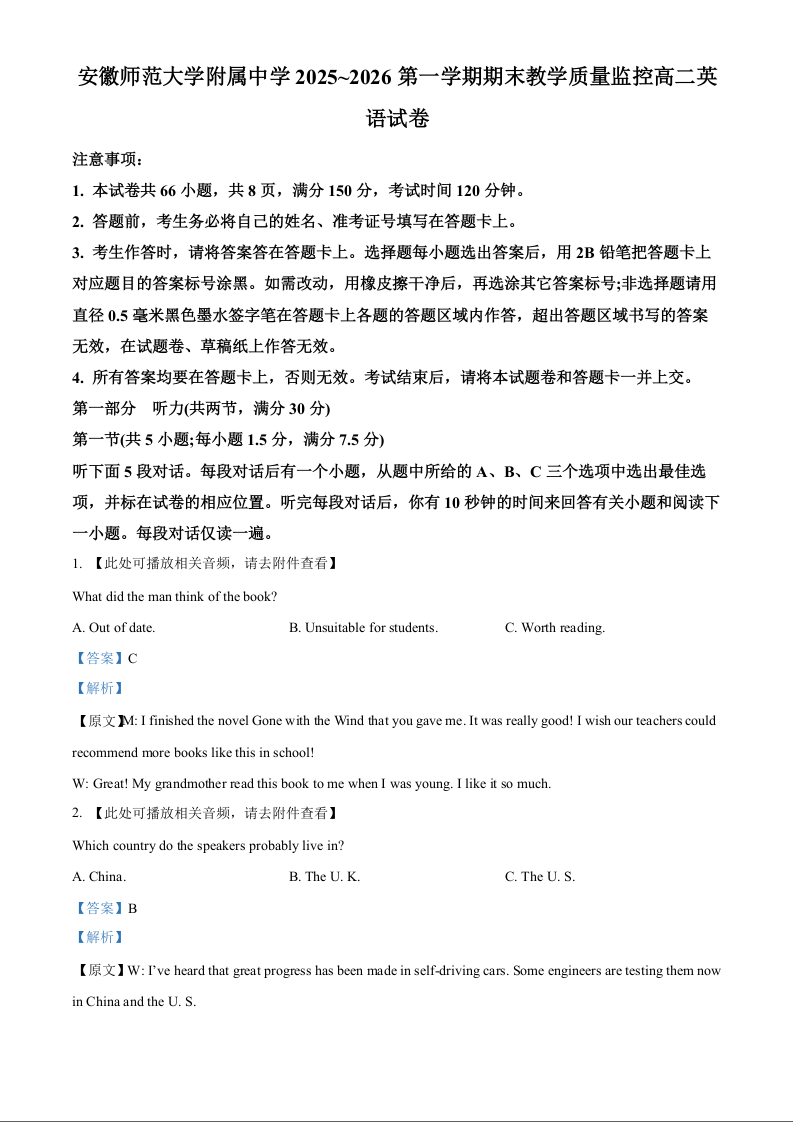 高二英语(解析版)--安徽省芜湖市师大附中2025-2026学年高二上学期期末考试